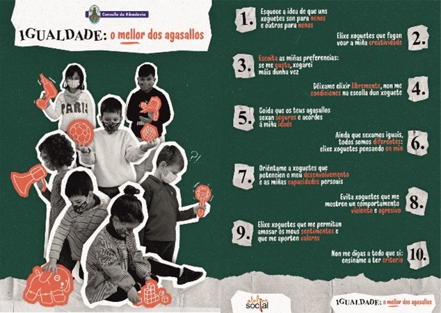 Preparamos esta interesante campaña de promoción de juegos y juguetes no sexistas y no violentos para el Ayuntamiento de Ribadavia, con actividades en los centros educativos, material para las familias y carteles para el comercio.
